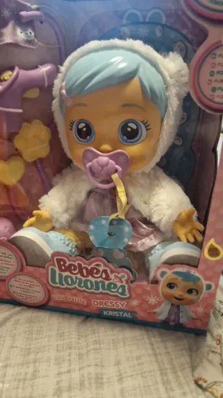 Muñeca de la colección Bebés Llorones, modelo Dressy Kristal. Viene en su caja original. - Muñeca con pelo azul y traje blanco. - Incluye chupete y accesorios. - Diseño con temática invernal.