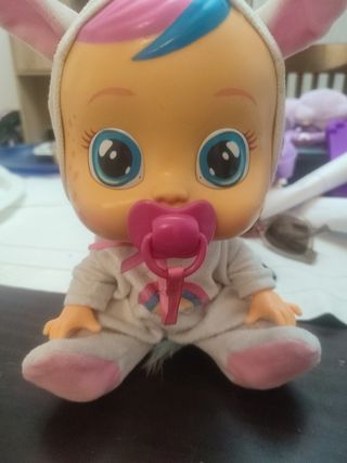 Llorona con disfraz de conejita, ideal para niñas. Es una muñeca adorable y tierna, perfecta para jugar. - Lleva un bonito conjunto de conejita rosa con lunares blancos. - Incluye chupete. Funciona perfectamente, se vende sin pilas. Como se aprecia en las fotos tiene una inicial marcada en el brazo; y en la parte interior trasera del gorro, aunque tenue, el nombre de mi hija. Por lo demás esta impecable.