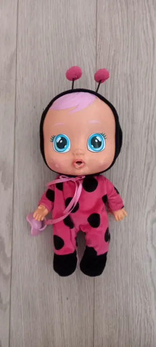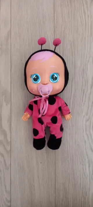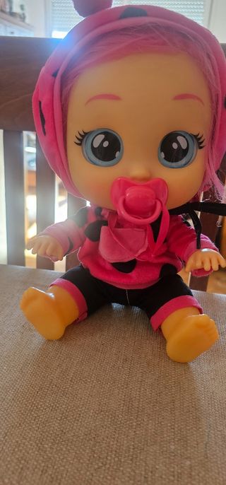 Muñeca Bebé Llorón Cry Babies con disfraz de mariquita. Se rellena de agua y al quitar el chupete llora lágrimas de verdad. Pequeño defecto en el moflete por eso el precio. Funciona con pilas (no incluidas) Entrega en mano o envío.
