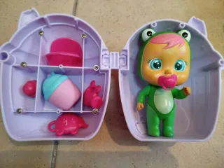 Set de muñeca Bebé Llorón con su casita y accesorios. - Muñeca con traje de rana. - Incluye biberón, trona y otros complementos. - Casita morada con compartimentos.