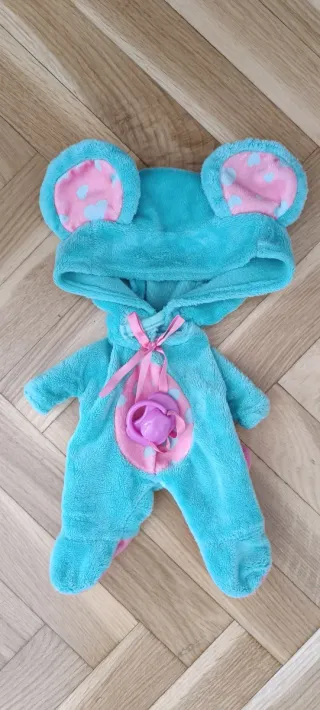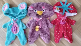 Conjunto de tres adorables trajes para muñecos Bebés Llorones. - Traje de ratón azul con orejas y detalles rosas. - Traje de búho morado con alas y pico amarillo. - Traje de fresa rojo con estampado de semillas blancas y caperuza.