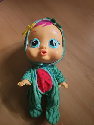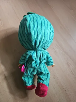 Muñeco bebé llorón con temática de sandía. - Pijama verde con rayas y estampado de sandía. - Capucha con detalles de hojas y una flor amarilla. - Pelo rosa.