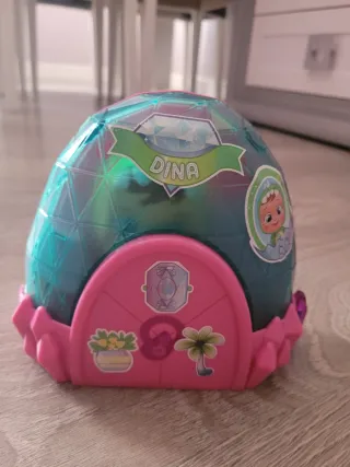 Casita de juego para las muñecas Bebés Llorones. - Incluye casita, muñeco con forma de pez, y biberón. - Diseño en forma de huevo con tapa. - Color rosa y detalles de burbujas y vida marina.