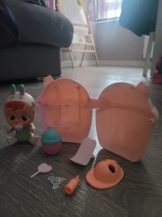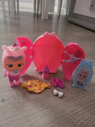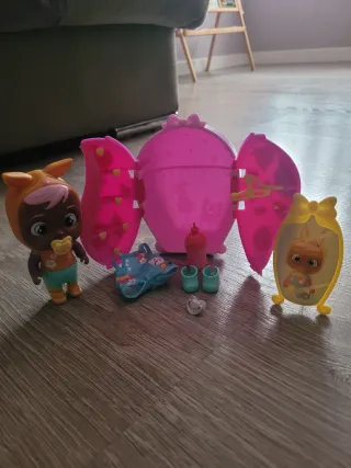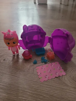 Set de juego de la Casita de los Bebés Llorones. Incluye varios accesorios para jugar. - Figura de bebé llorón con traje de unicornio. - Ropita amarilla con corazones. - Zapatos rosas. - Biberón. - Lazo blanco. - Espejo. - Colgador azul.
