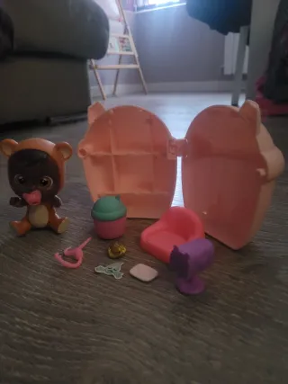 Set de juego de la casita de los Bebés Llorones. Incluye la casita y varios accesorios. - Casita de color rosa con forma de huevo. - Figura de bebé con capucha de oso. - Sillita rosa. - Buzón morado. - Biberón. - Otros accesorios pequeños.
