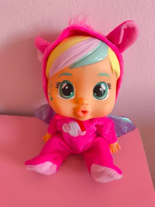 Muñeca Cry Babies modelo Hannah. Perfecto estado. - Pelo multicolor con mechas. - Traje rosa con capucha y orejas. - Alas moradas brillantes. - Detalle de nube con brillo en el pecho.