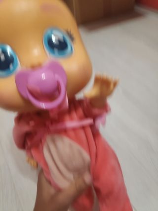Bebe lloron blandito, con luces, se le iluminan las estrellas de la barriguita, llora como los bebés llorones, y hace ruiditos....Nunca han jugado con el, solo le sacaron de la caja y lo guardaron...