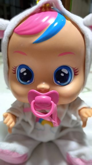 Muñeco bebé llorón con detalles de fantasía. - Pelo rubio con mechas de colores. - Pijama rosa con detalles brillantes. - Gorro rosa con orejas de unicornio. - Chupete rosa.