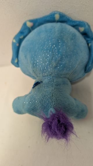 Tiene depósito en la cabeza y hueco para pilas en la espalda. llora y hace ruidos de bebé. La ropita es un mono de unicornio arcoiris.