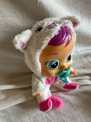 - Lleva un bonito disfraz de gatito blanco y rosa. - Incluye chupete. - Llora de verdad