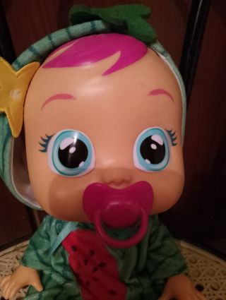 Muñeca Bebé Llorón con disfraz de sandía. Es una monada, ideal para niñas y niños. Tiene depósito en la cabeza, y si se le quita el chupete llora y si se le pone deja de llorar