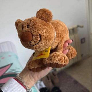 Adorable hucha con forma de oso de peluche. - Color marrón. - Tacto suave. - Incluye etiqueta amarilla con texto. - Llaves y candado