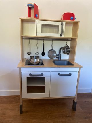 Divertida cocina de juguete de Ikea, ideal para los más pequeños. - Incluye accesorios como ollas, sartenes y utensilios. - Cuenta con horno, microondas y fregadero. - Diseño de madera y blanco.