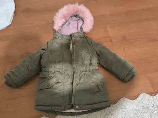Chaqueta de invierno para niña con capucha. - Color verde militar. - Forro interior rosa. - Detalle de pelo rosa en la capucha. - Cintura ajustable con cordón. - Bolsillos delanteros con solapa.