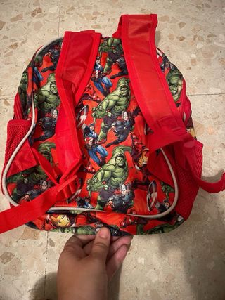 Mochila infantil con diseño de los Vengadores. - Personajes: Iron Man, Hulk y Capitán América. - Logo de los Avengers. - Bolsillos laterales de malla roja.