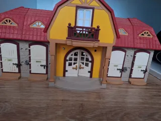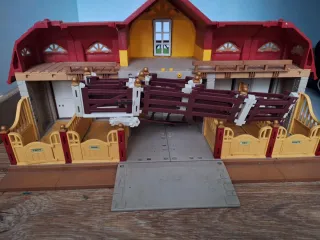 Gran patio ecuestre de Playmobil, modelo 5221. Incluye establos y vallas. - Estructura de plástico rojo y amarillo. - Puertas de establo. - Vallas de color marrón.