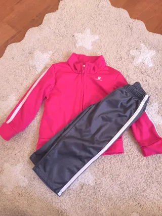 Conjunto deportivo de dos piezas de Decathlon. - Chaqueta de color rosa fucsia con cremallera. - Pantalón largo de color gris. - Rayas blancas laterales en ambas prendas.
