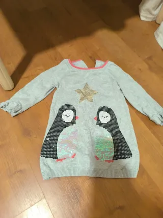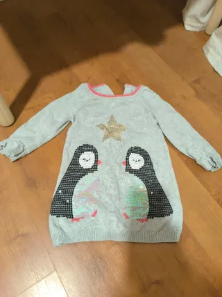 Vestido de punto gris para bebé con un diseño encantador de pingüinos. - Detalle de lentejuelas reversibles en los pingüinos. - Estrella dorada brillante en el pecho. - Cuello y puños con borde rosa. - Manga larga. - Botones de detrás en forma de estrella