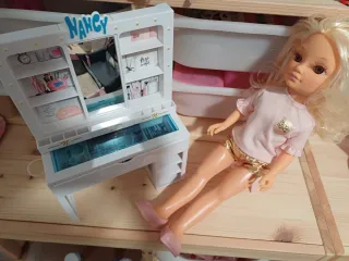 Tocador de la muñeca Nancy, modelo Peluquera, con su espejo y cajones. - Incluye varios accesorios de peluquería y maquillaje. - Diseño blanco con detalles dorados y azules. - Nombre 'Nancy' personalizado en la parte superior.