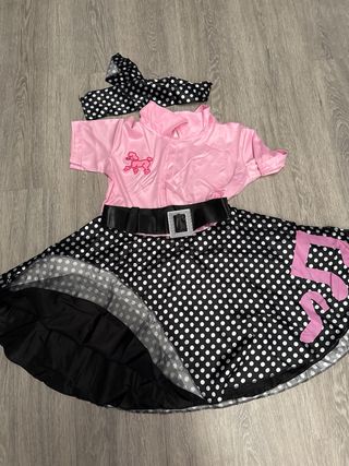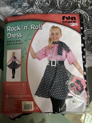 Disfraz de rock 'n' roll para niña, talla XL. Incluye vestido con enagua, cinturón y pañuelo. - Vestido de lunares con detalles rosas. - Cinturón negro con hebilla. - Pañuelo a juego con lunares.