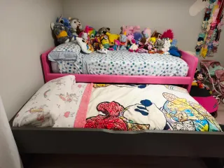Vendo dormitorio infantil o juvenil con muy poco uso. Solo se ha usado la cama de abajo durante dos años por una niña pequeña y la de arriba en ocasiones esporádicas (poquísimo). Las medidas están todas incluidas en las fotos. Cualquier duda, pregunté sin compromiso. Nos costó aproximadamente 1600€