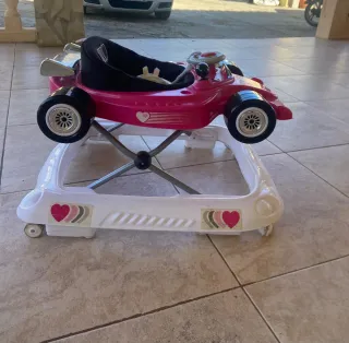 Andador para bebés con diseño de coche de carreras. - Color rosa vibrante. - Detalles de corazón en los laterales. - Asiento acolchado negro. - Ruedas negras con detalles plateados.