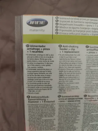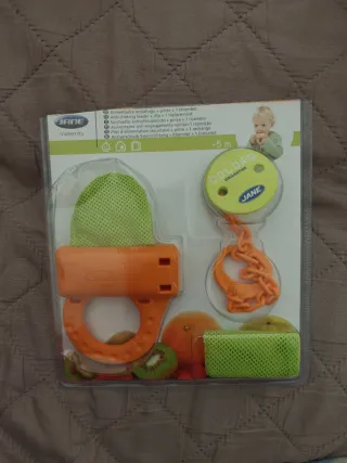Alimentador antiahogo de la marca Jane, ideal para introducir alimentos sólidos a los bebés de forma segura. Incluye pinza y un recambio. Está abierto para ver cómo era,pero nunca se ha utilizado. - Apto para mayores de 5 meses. - Diseño con malla para contener los alimentos. - Incluye clip y cadena para sujetarlo.