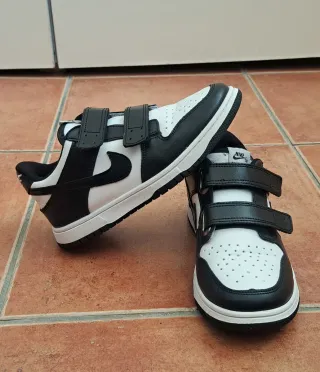 Zapatillas deportivas Nike Dunk para niños con cierre de velcro. - Diseño clásico en blanco y negro. - Swoosh icónico de Nike. - Cierre de doble velcro para un ajuste fácil.