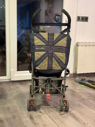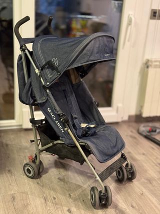 Silla de paseo Maclaren Quest en tejido vaquero. - Diseño moderno y funcional. - Capota de protección de varias extensiones - Cesta de almacenamiento inferior. - Ruedas delanteras giratorias. - Bolsa a juego con varios compartimentos