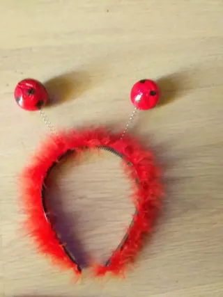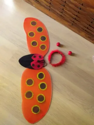 Conjunto de disfraz de mariquita para fiestas o eventos. - Alas naranjas con círculos negros y borde brillante. - Antenas rojas con bolitas. - Diadema roja con peluche.
