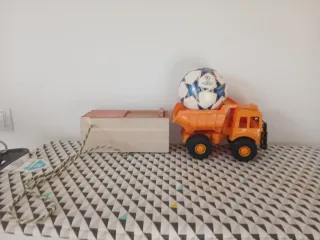 Lote de juguetes infantiles. - Camión volquete de plástico naranja. - Balón de fútbol con diseño de la Champions League.