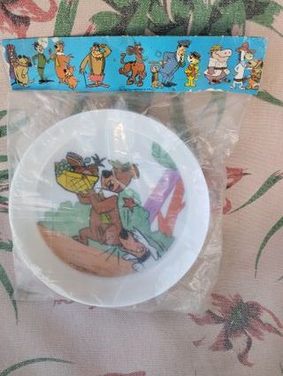 Pequeño plato con un dibujo del Oso Yogui y su amigo Boo - Personajes de Hanna-Barbera. -Plato de melamina vintage de don gato. Vajilla infantil y cadete estirilizable. Fabricado en efmen de Gijon. - Material resistente y seguro para niños. Medidas 16,5 cm de diametro y 3,5 cmde alto.