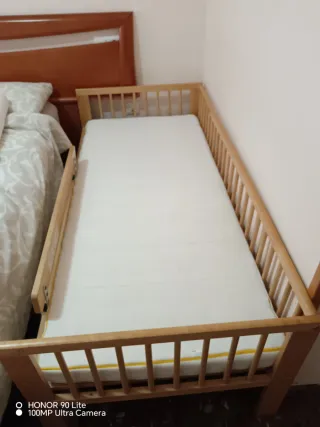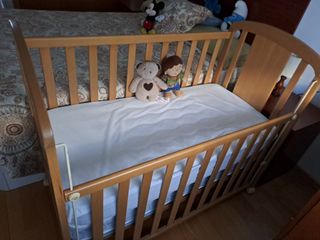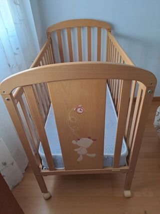 Medidas: 124 X 94 X 67 cm Material: Madera pino Color: Madera natural y Blanco Características: 5 posiciones de somier / Sistema push / Con ruedas / kit colecho incluido Ruedas de alta calidad de 60mm de diámetro con banda de rodadura en goma, ideal para parquet: Incluido colchón ,juegos de sábanas, edredón y protector de baldas .
