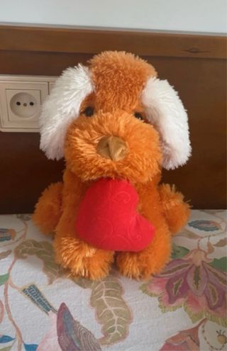 Adorable peluche de perro con un corazón rojo, perfecto para regalar en San Valentín. - Color naranja y blanco. - Corazón de tela roja con detalles. - Material suave y tierno.