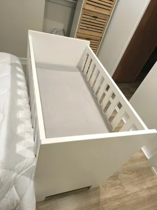 Cuna Ikea en color blanco. - Con ruedas para facilitar el movimiento. -Dos modos de uso, alta y baja tipo colecho. -Con opción de colocar cambidor como se ve en la foto. -DE REGALO: colchón, sábana impermeable cubre colchón y 3 sabanas com diferentes motivos. Ademas cambiador (está medio roto pero con el cobertor no perjudica su uso) y cubre cambiador con motivo de tortugas que se ve en la foto. *La guirnalda de la foto no la entrego.