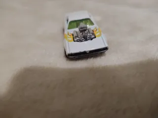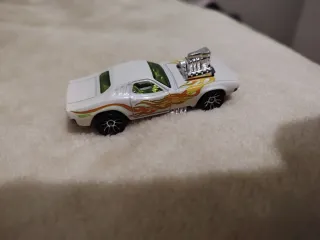 Coche de juguete Hot Wheels en color blanco con detalles llamativos. - Diseño deportivo con motor expuesto cromado. - Gráficos de llamas amarillas y naranjas en los laterales.