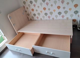 Litera infantil de madera, ideal para habitaciones de niños. Su diseño es sencillo y funcional. - Estructura de madera. - Barreras de seguridad blancas. - Somier de láminas. Somier adicional para poder hacerla litera. (Consultar precio) Actualmente esta desmontada.