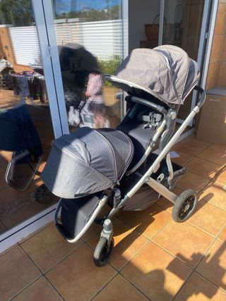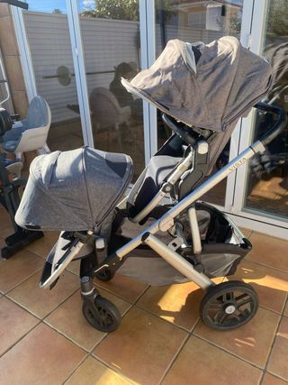 Carro UPPAbaby Vista en buen estado. - Color gris. - Diseño moderno y funcional. -Está completo con dos sillas y el capazo de recien nacido , con todos los plasticos para la lluvia y mosquiteras . Nuevo costó 1200€ . Lo vendo por la mitad de precio y esta usado pero perfecto y nada roto o desgastado .conservo hasta la caja de origen .