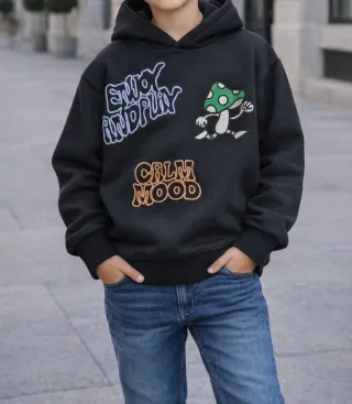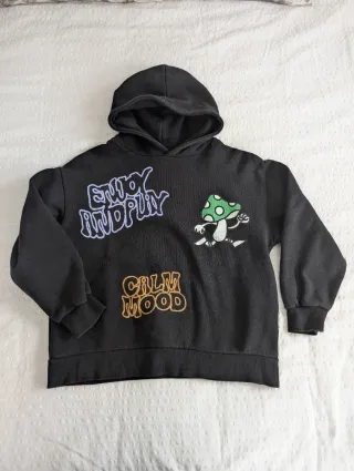 Sudadera de Zara para niño, talla 13 años. Diseño moderno con estampado. - Sudadera con capucha. - Estampado frontal con Enjoy and play y Calm mood. - Dibujo de seta animada.