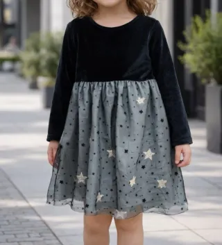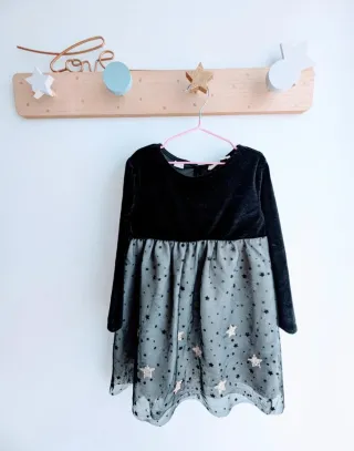 Vestido de Zara para niña, talla 2-3 años. Precioso vestido con cuerpo de terciopelo negro y falda de tul gris con estrellas doradas y negras. - Cuerpo de terciopelo. - Falda de tul con estampado de estrellas. - Manga larga.