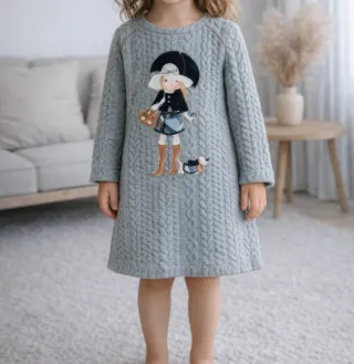 Vestido de punto de la marca Mayoral, talla 3 años. Presenta un diseño tejido con un bonito estampado. - Tejido de punto. - Estampado de niña con paraguas y perro.