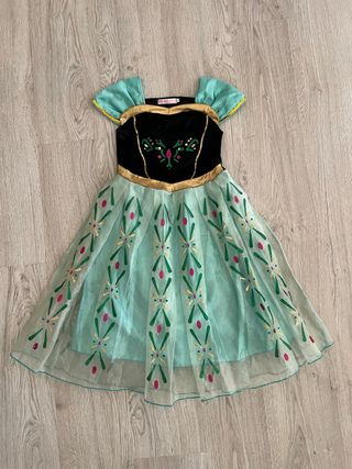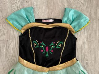 Disfraz de la princesa Ana de Frozen, ideal para fiestas o juegos. - Diseño inspirado en el personaje. - Colores: negro, verde menta y dorado. - Falda con detalles decorativos.