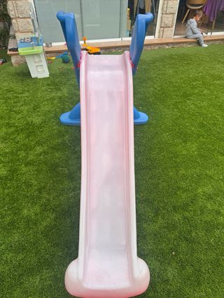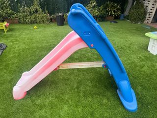 Tobogán infantil de la marca Little Tikes, perfecto para el jardín. - Diseño de dos colores: rojo y azul. - Estructura de plástico resistente. - algunas grietas en los peldaños.