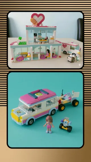 2 sets de construcción Lego Friends descatalogados actualmente. Incluye: - HOSPITAL DE HEARTLAKE CITY CON AMBULANCIA (41394), año 2020: • Modelo del 2020, actualmente retirado. • El edificio del hospital con varias plantas, tiene el instrumental en los cajones y soportes. • La ambulancia tiene la camilla en el interior. • Incluye las 3 figuras de originales con sus accesorios. - VEHÍCULO DE OPERACIONES DE OLIVIA CON ROBOT (41333), año 2018. • Modelo retirado del año 2018. • Furgoneta, con remolque (las ruedas son añadidas), escalera y robot. • Incluye la figura de Olivia. Ambos tienen accesorios y personajes. Sin cajas, ni instr