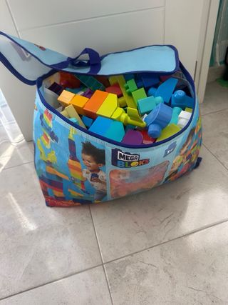 Set de bloques de construcción Mega Bloks para niños. Ideal para estimular la creatividad y la motricidad. - Piezas de colores variados: azul, naranja, verde, rojo, amarillo, morado. - Incluye diferentes formas y tamaños de bloques. - Bolsa de almacenamiento con cremallera.