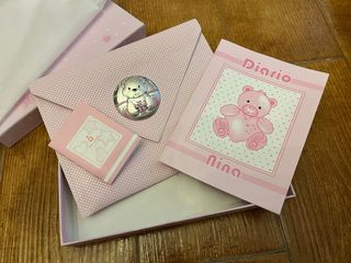 Precioso set de regalo para bebé con detalles en plata. - Sobre de libro de nacimiento con diseño de osito. - Libro para pegar fotos y apuntar los datos de nacimiento y eventos especiales. - Caja a juego
