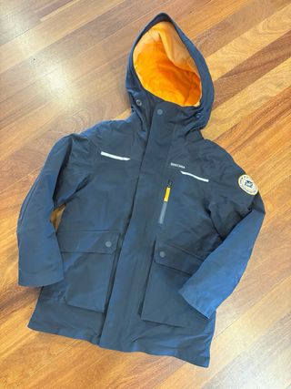Chaqueta impermeable Quechua en color azul marino. - Técnica y cómoda, es muy abrigada, según fabricante hasta -6,5°. - Relleno interior de guata y capucha cálida de forro polar. - Ajuste en puños, corte recto tipo parka. - Múltiples bolsillos, incluso 2 laterales con forro polar interior para las manos. El peke encantado con esta prenda, hemos comprado la misma para esta temporada.