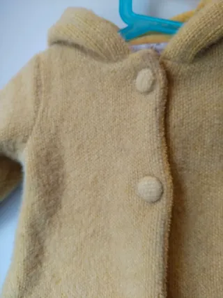 abriguito color mostaza con capucha de la marca Repanda. Muy blandito y cómodo. Talla 12 meses. En muy buen estado - Cierre de botones. - Forro interior amarillo.
