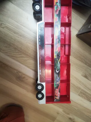 Camión de juguete de Rayo McQueen de la marca Rust-eze. - Diseño inspirado en la película Cars. - Incluye remolque con detalles gráficos.