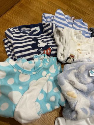 Lote de seis pijamas de invierno para bebé, talla 3-6 meses (68cm). - Pijamas de manga larga. - Diseños variados con rayas, Mickey Mouse, puntos y ositos. - Tejido suave para mayor comodidad. - Cierre de botones o cremallera.